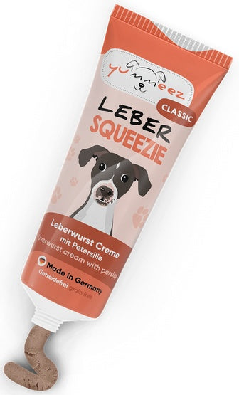 Yummeez Classic Squeezie Wątróbka to aromatyczna pasta do lizania w poręcznej tubce, stworzona jako szybka, czysta i maksymalnie precyzyjna nagroda dla psa. Zamiast szukać smaczków w kieszeni lub nosić kruszące się kąski, możesz nagradzać dokładnie w tym momencie, w którym pies zrobił to, o co prosisz. Wątróbkowy smak jest dla wielu psów szczególnie atrakcyjny, a sama forma „do lizania” działa uspokajająco i pomaga utrzymać koncentrację podczas nauki, w podróży czy w trudniejszych sytuacjach (np. na spacerze w mieście, wśród rozproszeń).