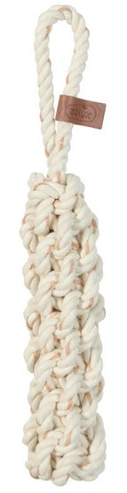 Zabawka szarpak uchwyt LEATHER TOUCH to innowacyjny produkt z nowej serii zabawek ZOLUX. Wykonana z bawełnianego sznurka przeplatana skórzanymi paskami ze skóry bydlęcej, zabawka z uchwytem do przeciągania łączy funkcję szarpaka z korzyściami zdrowotnymi dla jamy ustnej psa.