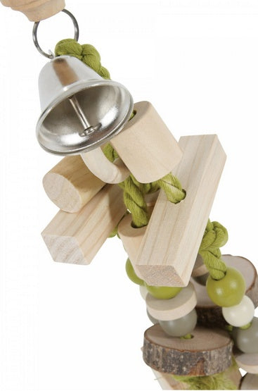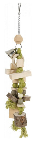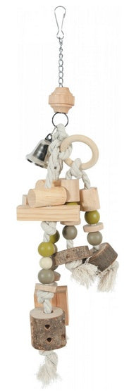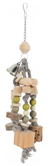 Wykonana z połączenia elementów drewnianych, kolorowych sznurków, koralików oraz dzwoneczka. Produkt wyposażono w praktyczny karabińczyk, dzięki czemu z łatwością można przymocować go do prętów klatki.